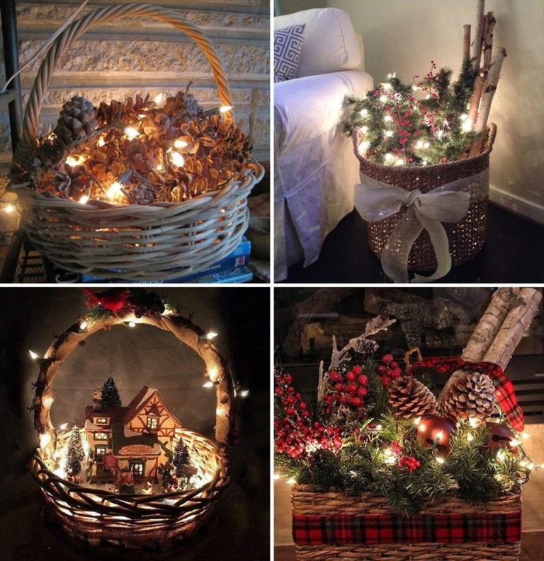 A kosarakat megtöltheted fenyőtobozokkal vagy karácsonyi gömbökkel, esetleg adhatsz hozzá égőket. Használhatod őket kis betlehem alapjaként is, vagy használhatsz fenyőágakat és angyalhajat.