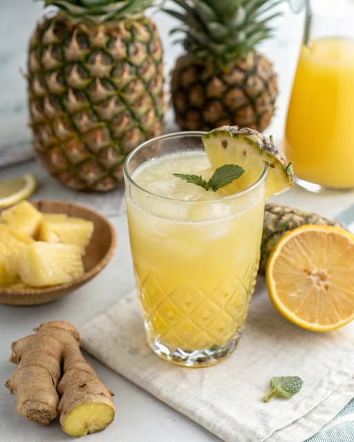 Ez a friss gyümölcslé édes ananászt és pikáns gyömbért ötvöz a vitalitás fokozásáért. Tökéletes az energiaszint növelésére reggel, vagy egy frissítő szünetre.