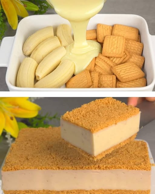 Ez a sütés nélküli banános-sűrített tejes sütemény egy álom, amit minden édesszájú megtalál, aki valami különlegeset keres, amit gyorsan felszolgálhat. Nincs sütő, nincs tojás, és villámgyorsan elkészül! Az eredmény egy krémes, puha sütemény, omlós kekszes alappal, ami elolvad a szádban. Tökéletes gyors desszertként, váratlan vendégeknek, vagy egyszerűen csak magadnak egy kis kényeztetésnek.