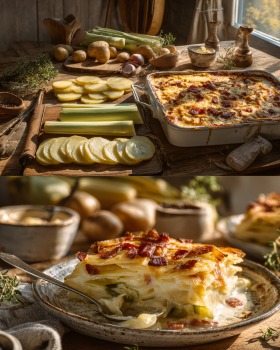 Ez a póréhagymás-baconös burgonyagratín egy szívmelengető rakott étel, ami minden elvárásnak megfelel: belül krémes, ízletes és szaftos, a tetején pedig aranybarna kéreg. A póréhagyma lágy, édes ízt kölcsönöz az ételnek, míg a bacon tökéletes sós ízt ad. Önmagában is finom főétel, de húsok mellé vagy téli salátának is remek köret. Egyszerű elkészíteni, tökéletes előre elkészíteni, és garantáltan minden korosztály számára ízlik!