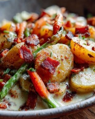 Ez a zöldséges-baconös burgonyaragu egy klasszikus, rusztikus étel, amely tökéletesen illik ahhoz, amit a képen látsz: aranybarna burgonya, ropogós bacon és színes zöldségek, mindezt krémes szószban. Otthonos hangulatot áraszt, és pontosan az a fajta étel, amit akkor tálalsz, ha valami meleg, laktató és ízletesre vágysz.
