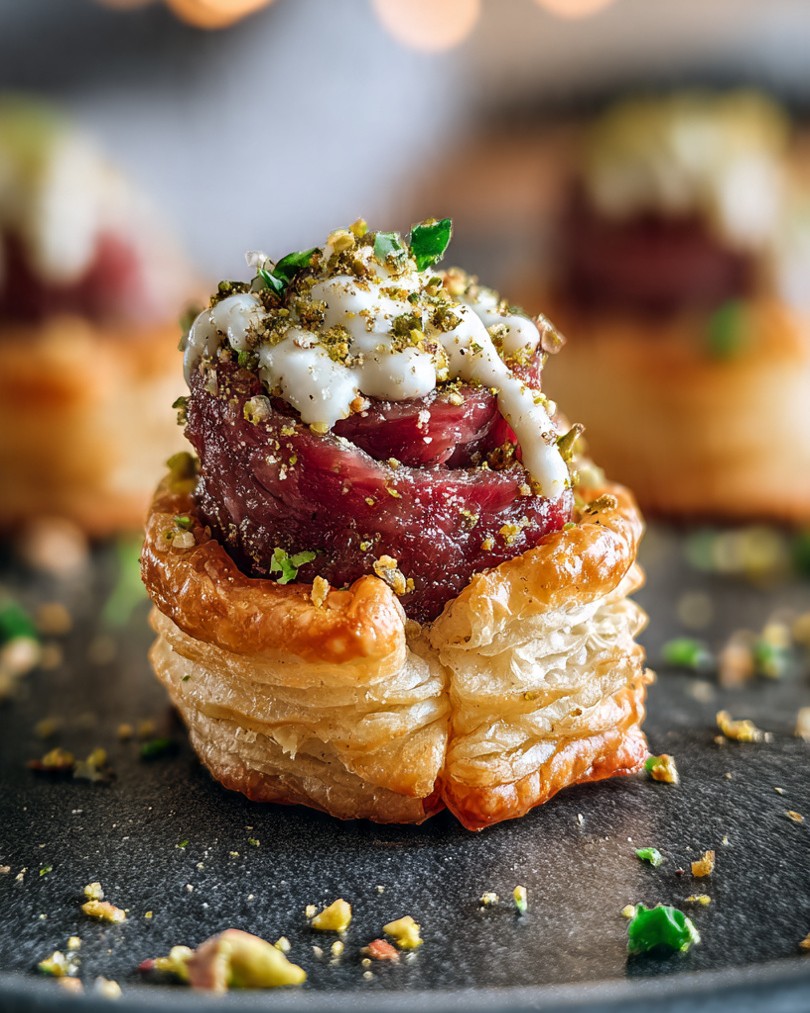 Ez a ropogós leveles tésztára helyezett carpaccio bonbon egy elegáns és modern előétel, amely tökéletes ünnepi alkalmakra. A képen egy ropogós, világos és aranybarna leveles tésztalap látható, tetején egy szorosan feltekercselt, ostyavékonyra tekert carpaccio bonbonnal. A krémes parmezánkrém és a finomra vágott pisztácia tetején nemcsak luxus megjelenésű, hanem a sós, krémes és ropogós ízek tökéletes egyensúlyát is biztosítja.