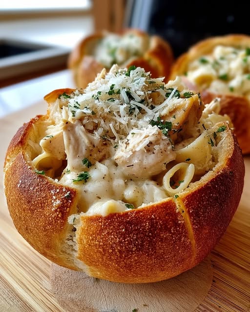 Képzeljen el egy meleg és laktató vacsorát: puha csirke, krémes tészta Alfredo szósszal, mindezt egy tál ropogós, fokhagymás kenyérben tálalva. Ez az étel mindent egyesít magában, amit szeretünk: puha, krémes és ropogós, tökéletes arra, hogy lenyűgözze családját vagy vendégeit egy laza vacsorapartin!