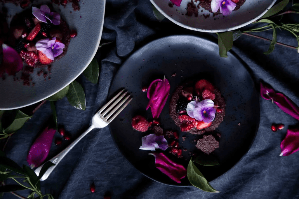 - Rendezd el a bogyós gyümölcsöket (és az ehető virágokat, ha használsz) a ganache-ban és azok között.