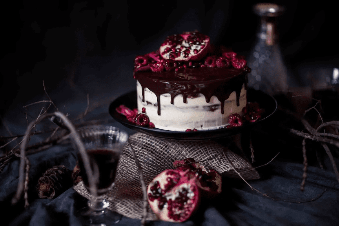 A torta belsejében három réteg enyhén csokis, puha gyümölcstorta található, melyeket könnyű mascarponés krémmel töltöttem és vontam be. A csokoládé ganache fényessé teszi, én pedig mindenféle piros színűvel megszórtam, amit csak találtam – gránátalmával, málnával és rózsaszirmokkal. Használj nyugodtan bármit, amid szezonális! A buggyantott körte is remek lenne, akárcsak a vérszilva és a cseresznye.