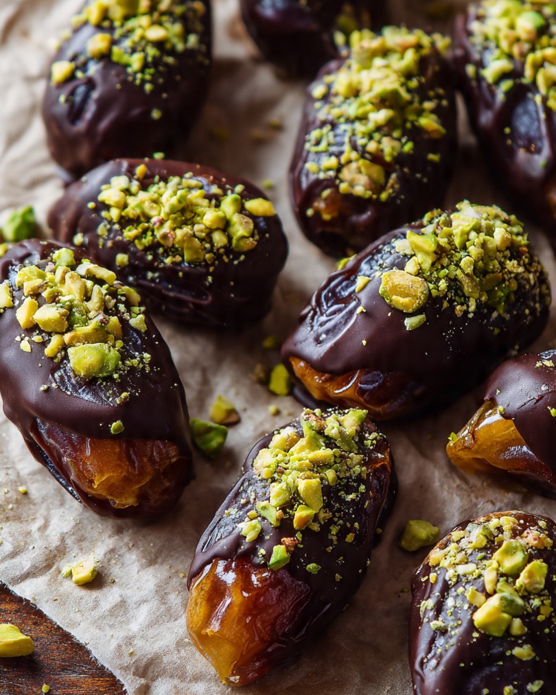 Ez a pisztáciával és csokoládéval ízesített datolyasnack egy elegáns és kifinomult édesség, amely tökéletesen illik ahhoz, amit a képen lát: puha, fényes datolya, gazdagon bevonva étcsokoládéval, durvára vágott pisztáciával a tetején. A datolya természetes édessége, a csokoládé intenzív íze és a pisztácia diós frissessége közötti kontraszt teszi ezt a luxus nassolnivalót egyszerűvé és különlegessé.