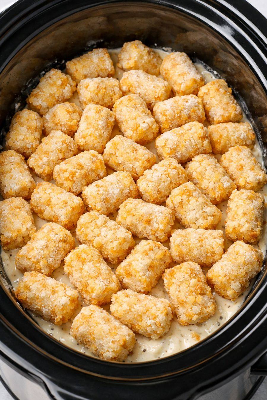 Készítse el a tejszínes szószt: Egy közepes tálban keverje össze a gombaleves krémes részét, a tejet és a fél csésze reszelt cheddar sajtot. Így egy egyszerű tejszínes szószt kap, amely a lassú főzőben is megőrzi gazdagságát és ízét.