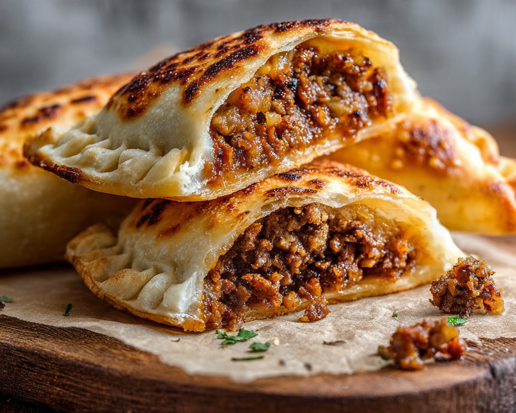Az empanadákat világszerte szeretik ropogós tésztánk és ízletes töltelékük miatt, ez a darált shawarma húsos változat pedig intenzíven fűszeres és kivételesen aromás szintre emeli az ízeket. A képen gyönyörűen aranybarnára sült empanadák láthatók, melyeket bőségesen töltenek krémes darált shawarma keverékkel, amely mély, meleg színt kap a fűszerektől. A széleket gondosan behajtják, így az empanadák nemcsak vizuálisan vonzóak, hanem tökéletesek harapnivalóként vagy előételként is.