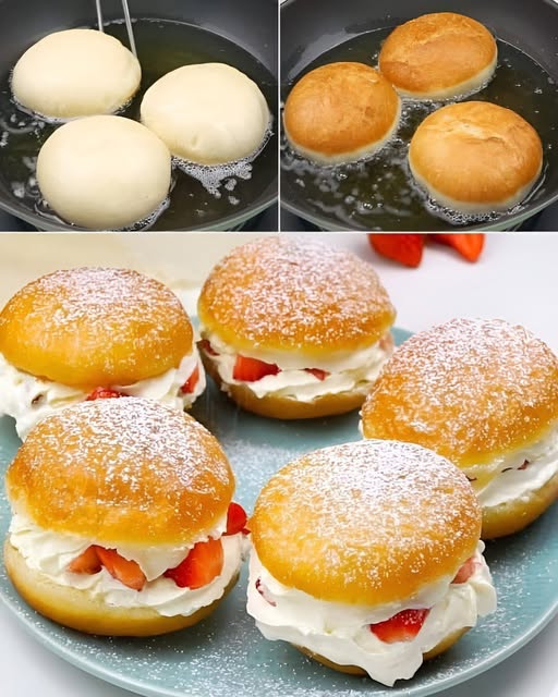Kívánnál egy olyan desszertet, ami úgy néz ki, mintha egyenesen a pékségből jött volna, de meglepően könnyű otthon elkészíteni? Ezek az eperbombák puha, aranybarna fánkok, melyeket bolyhos tejszínhabbal és friss eperrel töltenek – igazi íz- és állagrobbanás. Tökéletesek születésnapokra, villásreggelire, vagy egyszerűen csak egy kávé mellé.✨