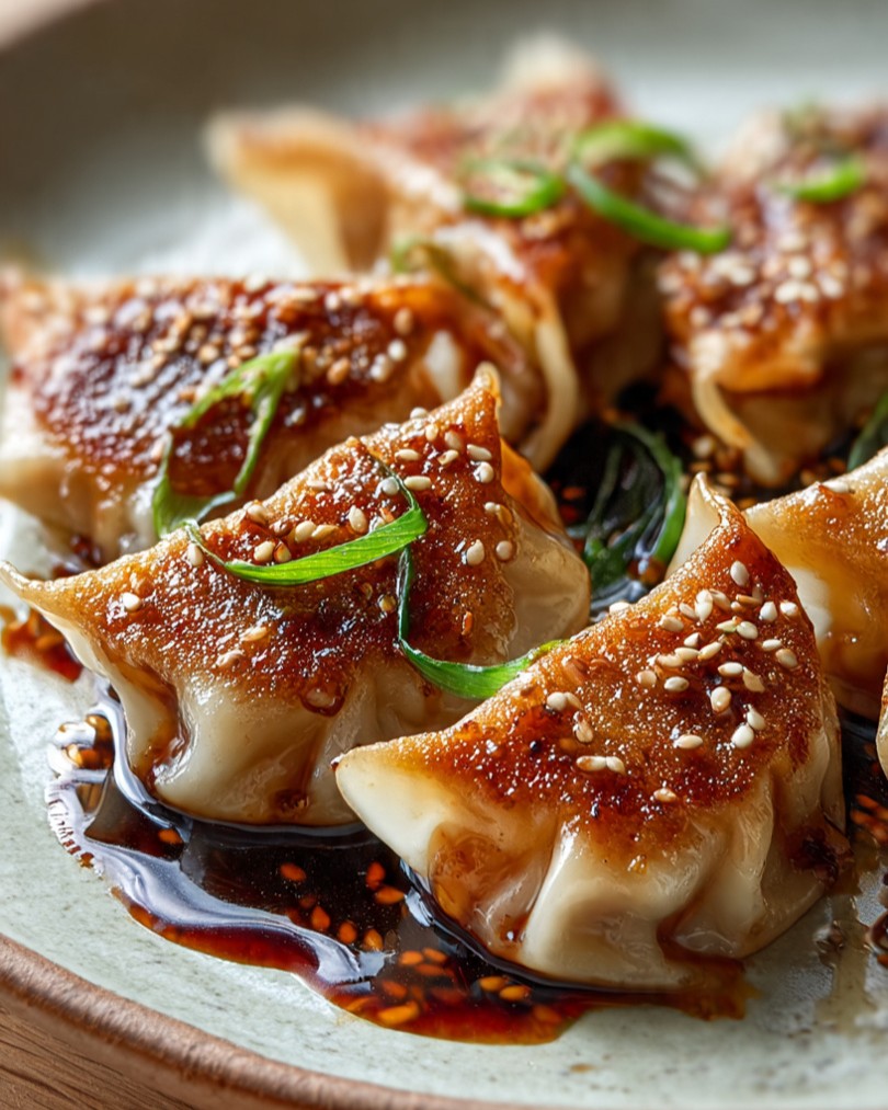 Ezek a ketjap szószos gyozák igazi tekinteteket gyönyörködtetőek az asztalon. A képen aranybarnára sült gombócok láthatók ropogós aljú, enyhén párolt tetejű, fényes ketjap szószréteggel, ami tócsába gyűlik a tányéron. Szezámmaggal és újhagymakarikákkal díszítve nemcsak professzionálisan néznek ki, de ízük is olyan, mintha egy japán utcai étteremből érkeztek volna.