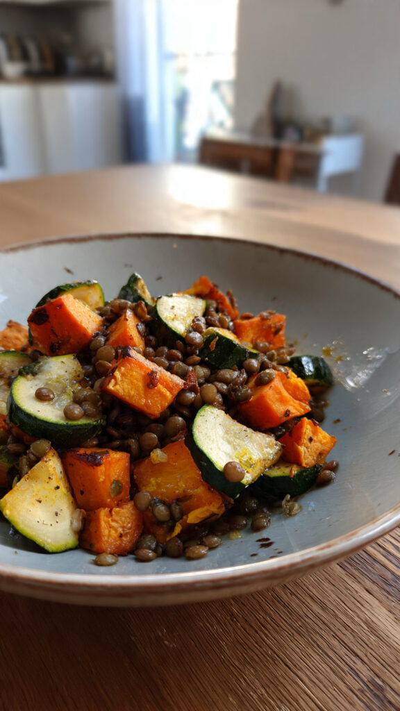 Ez az édesburgonyás és cukkinis lencsesaláta gyönyörűen ötvözi az egyszerűséget és a mélységet. A képen egy rusztikus, otthonos saláta látható, amelyben a sült édesburgonya-kockák és az aranybarna cukkini találkozik a puha lencsével. A zöldségeket egyértelműen addig főzzük, amíg színt és ízt nem kapnak, míg a lencse földes, gazdag alapot biztosít.