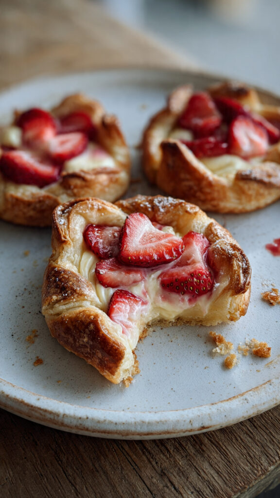 A mini galette-ek ropogós, enyhén réteges tésztával és puha, krémes közepével rendelkeznek. A krémsajtos töltelék enyhén édes, és tökéletes kontrasztot alkot a friss, lédús eperrel. A gyümölcs sütés közben enyhén karamellizálódik, természetes édességet hozva létre, amely harmonikusan illeszkedik a krémes alaphoz.