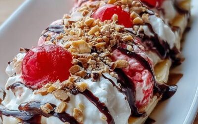 Hozzávalók;– Banán– Fagylalt (vanília, csokoládé, eper)– Tejszínhab– Csokoládészósz– Dió– Kandírozott meggyElkészítés;
