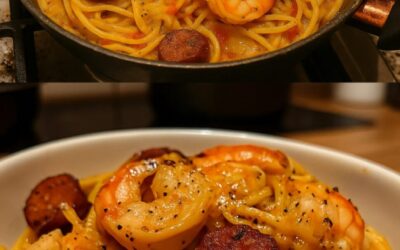 Spagetti kaliforniai paprikás tejszínes szósszal, A chorizo és a garnélarák egy finom étel, amely a mediterrán ízeket krémes, élénk szószban…