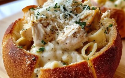 Csirkés Alfredo fokhagymás kenyértálak Képzeljen el egy meleg és laktató vacsorát: puha csirke, krémes tészta Alfredo szósszal, mindezt egy tál…