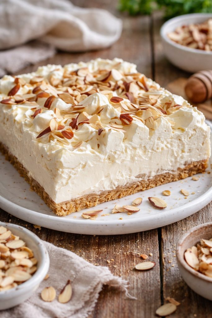 Miután langyosra hűlt, tedd be a hűtőbe, hogy teljesen kihűljön. Tálaláskor tálald a süteményt, és díszítsd ropogós mandulával, amit csokoládéforgáccsal vagy tejszínhabbal is megszórhatsz. Isteni!