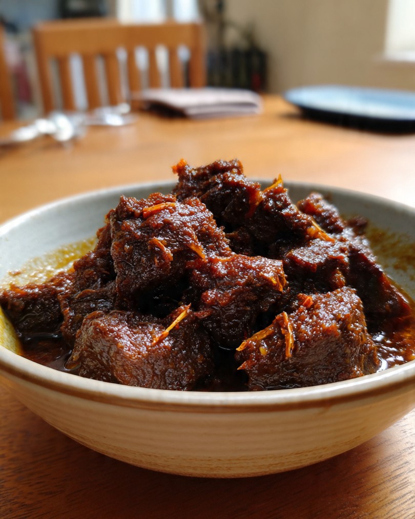 A Rendang egy mély színű, intenzív aromájú pörkölt, amelyben a húst lassan, gazdag, fűszeres szószban főzzük, amíg majdnem teljesen össze nem fő. Az eredmény sötétbarna, fényes marhahús, tömör, puha textúrával és a darabok körül vastag réteget alkotó szósszal. Az íze telt, meleg és rétegzett, jellegzetes mélységgel, amely csak a türelemnek és a lassú főzéshez vezethet. Ez az étel rusztikus, mégis erőteljes megjelenésű, és az indonéz konyha egyik legjellegzetesebb pörköltjeként ismert.