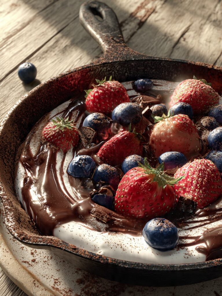 Ezek a gyümölcsös s'mores formák a tökéletes desszert azok számára, akik szeretik az olvasztott csokoládét, a krémes pillecukrot és a friss szezonális gyümölcsöket. A képen egy rusztikus öntöttvas forma látható, amelyben a csokoládé lassan megolvadt, puha fehér pillecukorral tarkítva, friss eperrel és áfonyával a tetején. A meleg és hideg, az édes és frissítő közötti kontraszt nemcsak vizuálisan vonzóvá, hanem tökéletesen kiegyensúlyozottá is teszi ezt a desszertet.