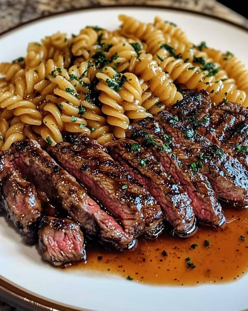 Egy jó tányér szaftos steak, mézes-fokhagymás mártással megszórt rotini tésztával, tökéletes kombináció egy ízletes és laktató étkezéshez.