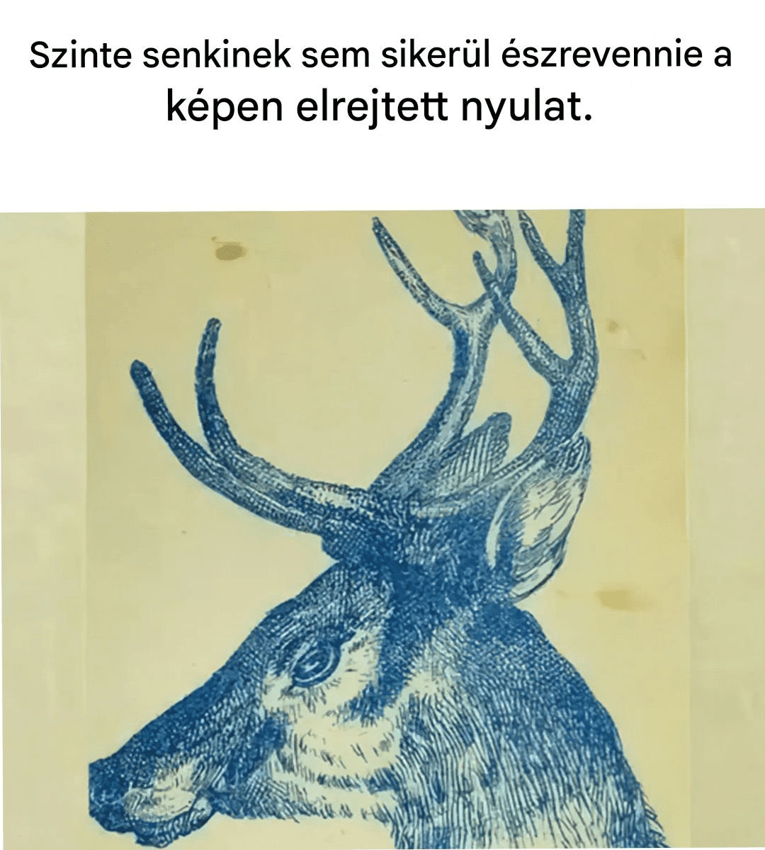 Első pillantásra a kép egyszerűnek tűnik: egy nagy szarvas fenséges agancsokkal, semmi szokatlan. Mégis, egy nyulat rejtenek el ügyesen benne, beleolvadva a rajz körvonalaiba.